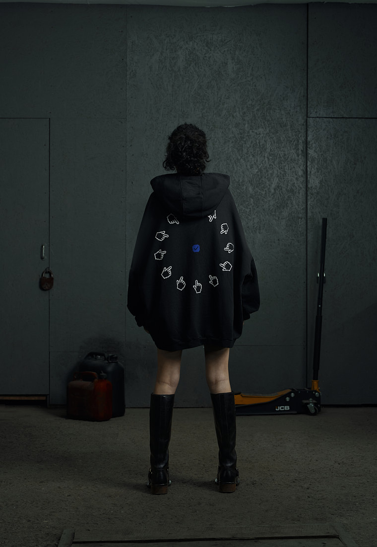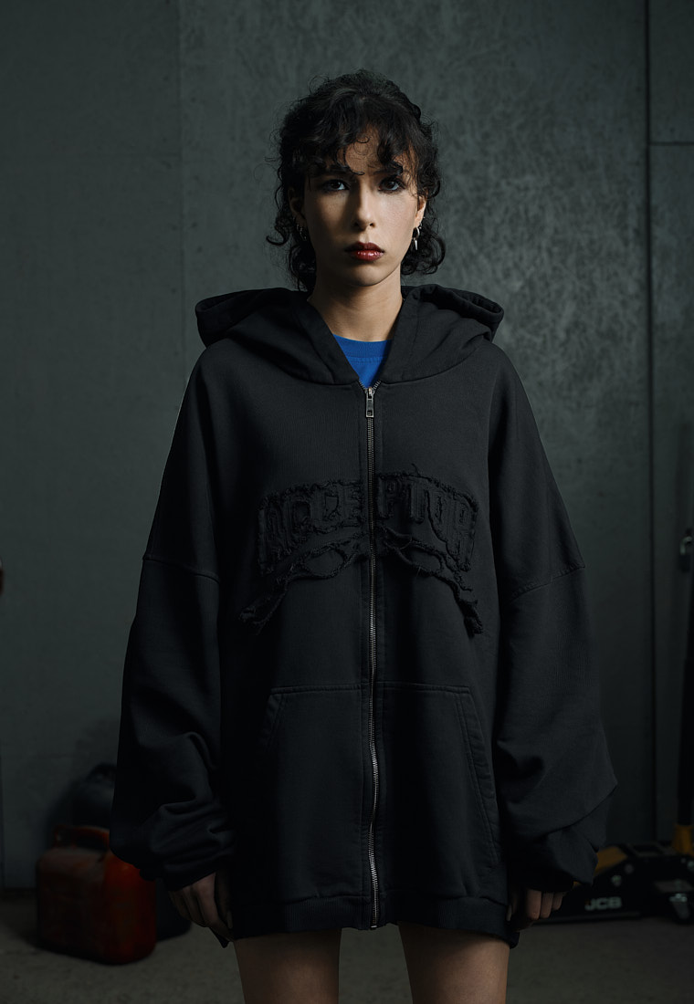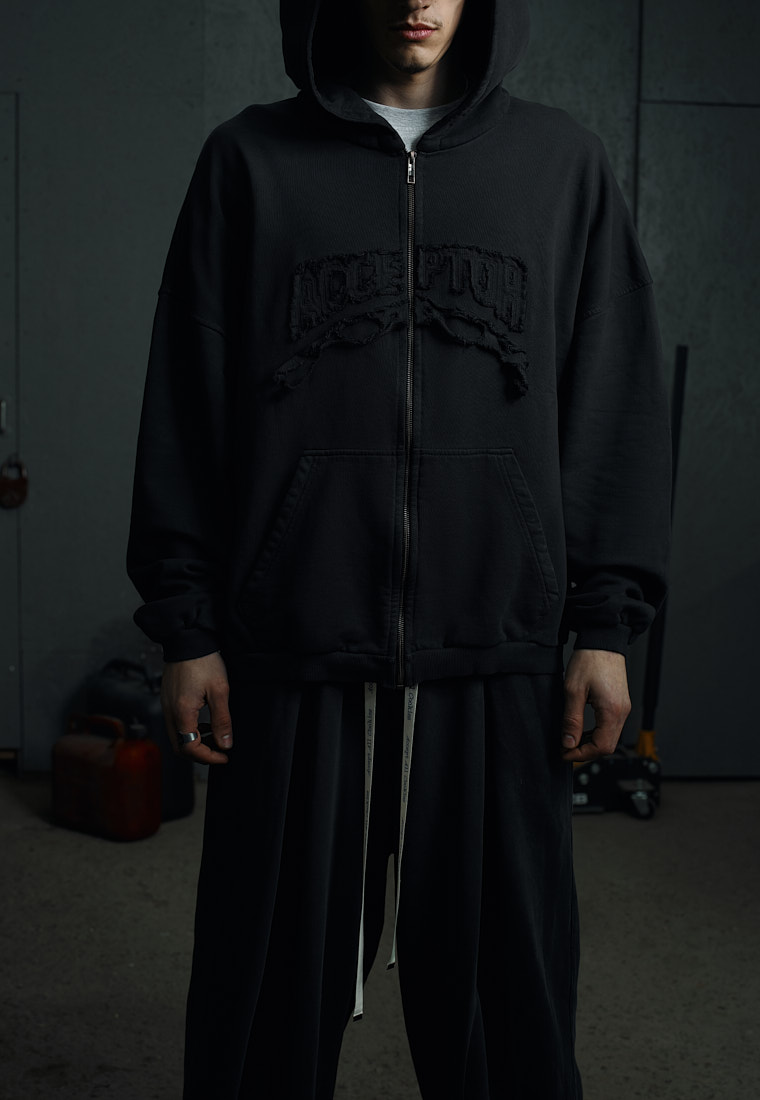 Зип худи "ACCEPTOR" выполнен из футера 3-нитки 400 грамм, искусственно состаренная ткань, спереди пришит логотип, сзади используется DTF печать.